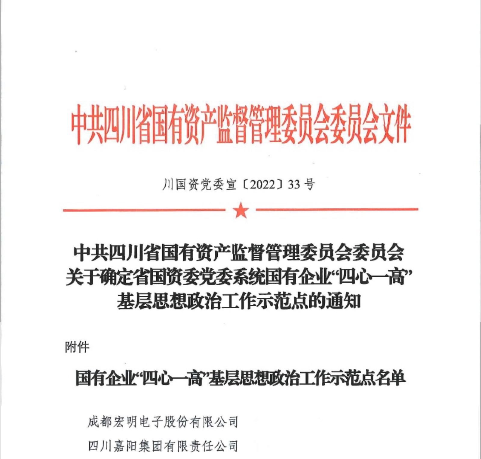 近日,中共四川省国有资产监督管理委员会委员会发布《关于确定省国资委党委系统国有企业“四心一高”基层思想政治工作示范点的通知》,川投集团所属成都宏明电子股份有限公司、四川嘉阳集团有限责任公司两家单位榜上有名,成功跻身示范点。