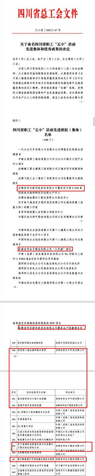 在全省职工“五小”活动中,“成都宏明双新科技股份有限公司模具设计部CAM 室”“成都宏明电子股份有限公司‘小灵通’团队”“成都宏明双新科技股份有限公司模具生产部磨削车间”获评“先进班组(集体)”,宏科电子3项成果、宏明电子2项成果获评“优秀成果”。