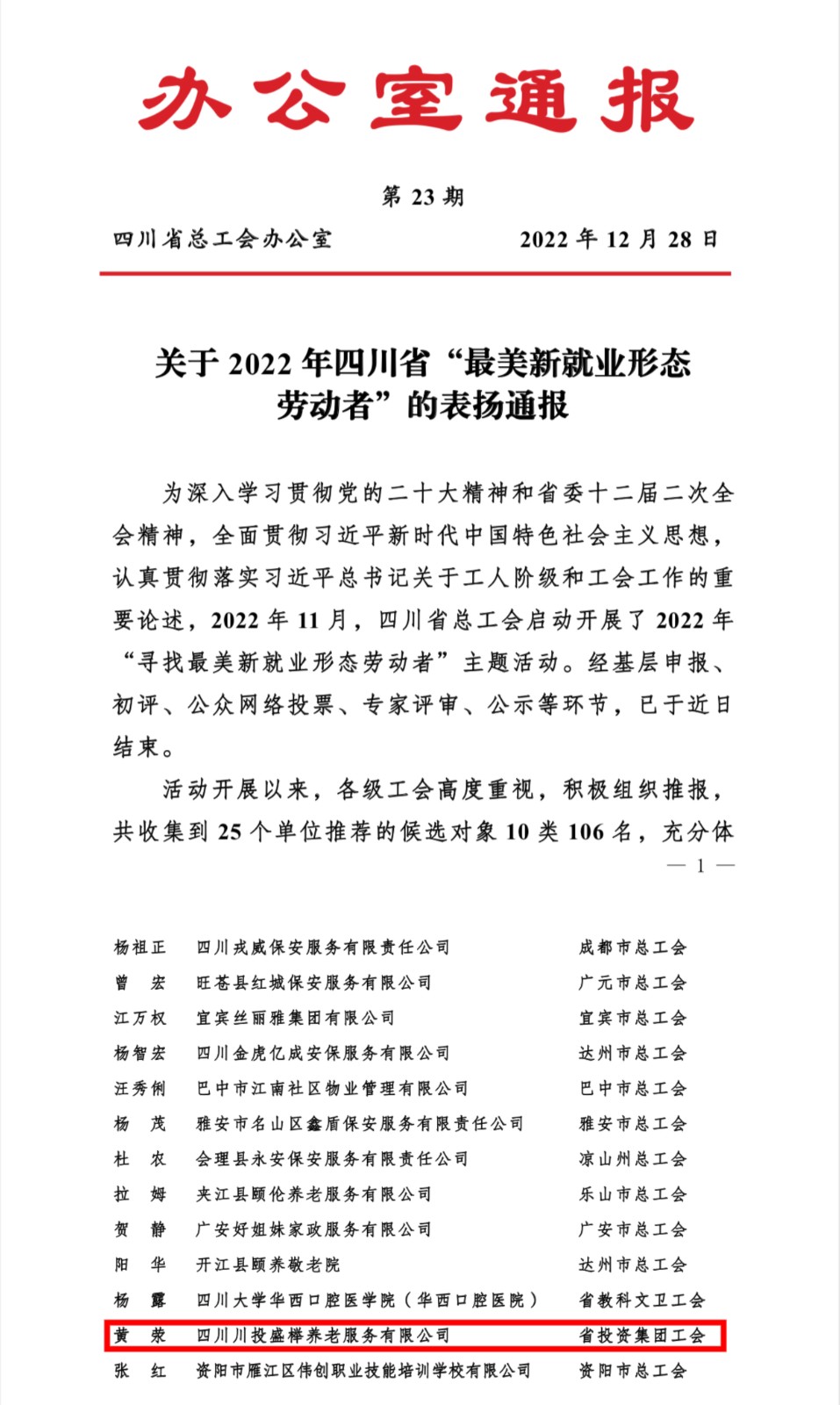 川投集团工会坚持以“服务基层、服务职工”为宗旨,围绕中心、服务大局,切实推进各类推优评先工作,2022年度全集团工会系统斩获全国、全省各类荣誉表彰26项。