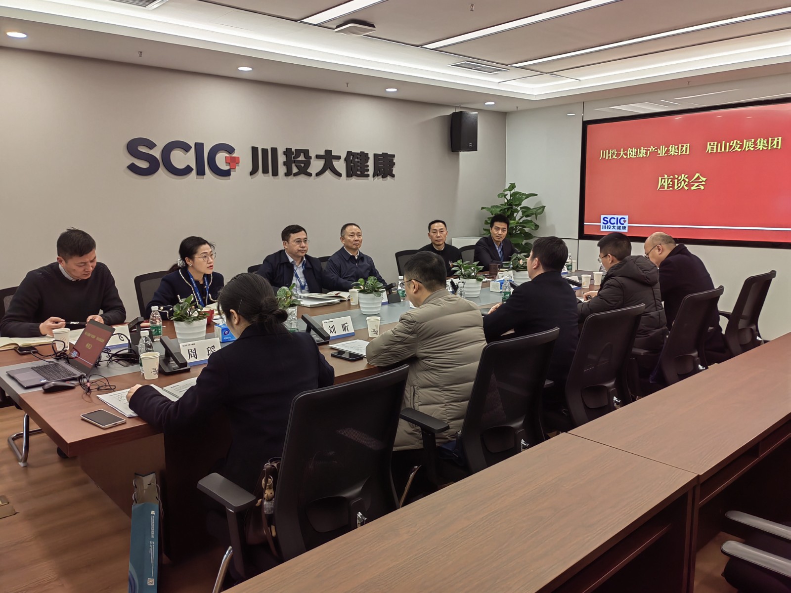 1月30日,眉山发展集团党委委员、副总经理王靖宇到访川投大健康产开展交流座谈。集团公司党委委员、副总经理王怀林出席会议。