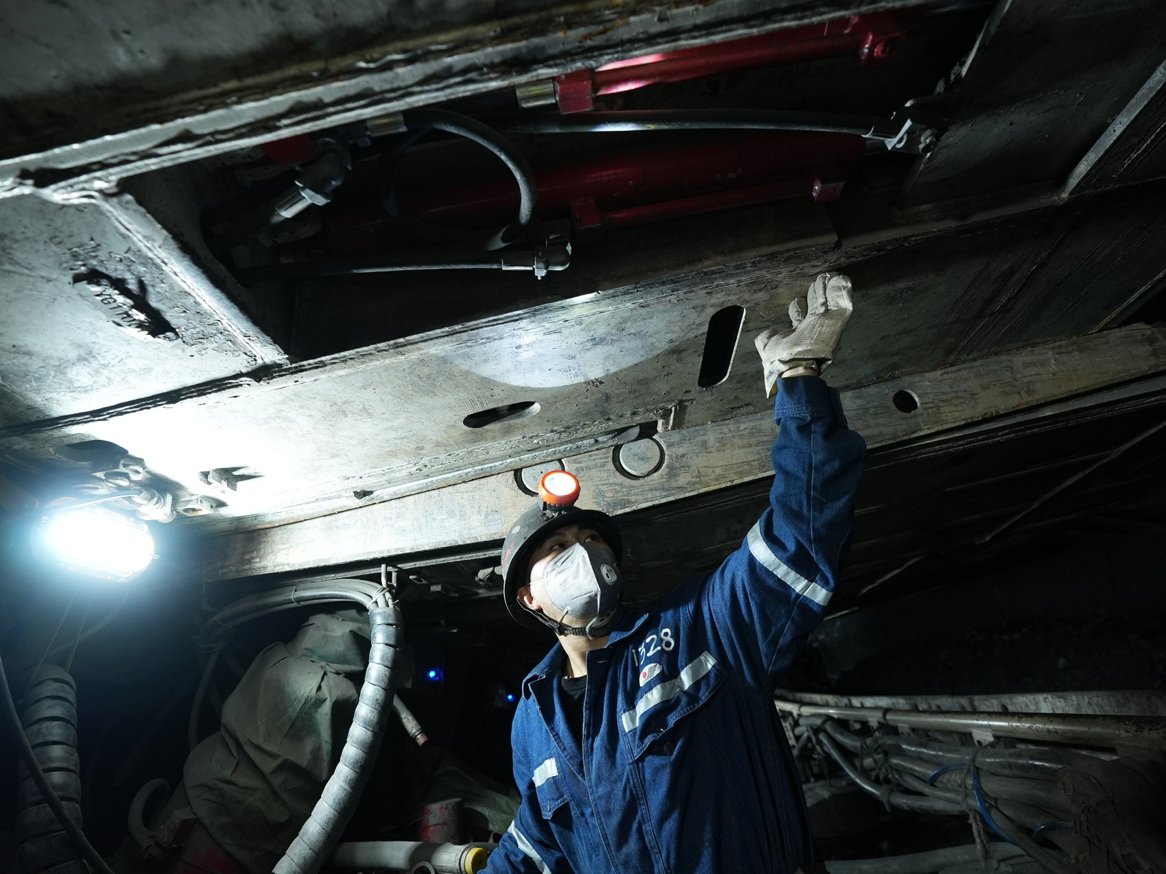 在嘉阳煤矿1205智能化综采工作面,支架巡护员肖红强正在查看支架安全。.jpg