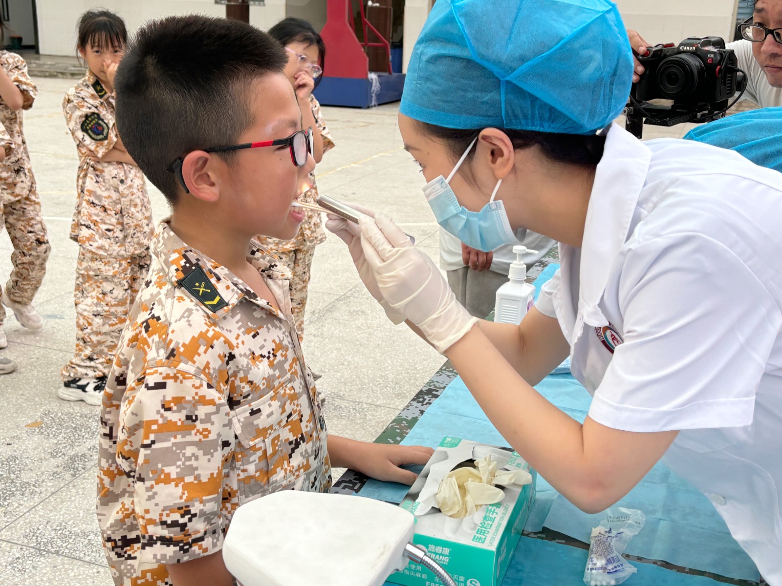 7月18日,重庆华西牙科医院爱牙公益行走进“我是特种兵”夏令营,为营区内的120名孩子免费检查口腔健康情况。