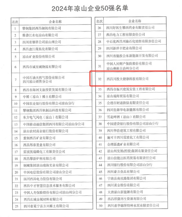 【川投大健康】川投西昌大健康公司荣获“2024年凉山企业50强”荣誉称号