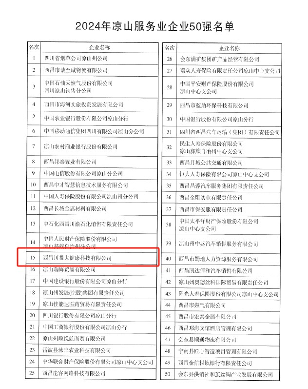 12月18日,凉山州企业联合会发布了“2024年凉山州企业50强”名单、“2024年凉山州工业50强”企业名单、“2024年凉山州服务业50强”企业名单。凭借自身一定的综合实力,川投西昌大健康公司荣登2024年凉山州企业50强名单,位列第32位,同时还位列“2024年凉山州服务业50强”企业名单第15位。