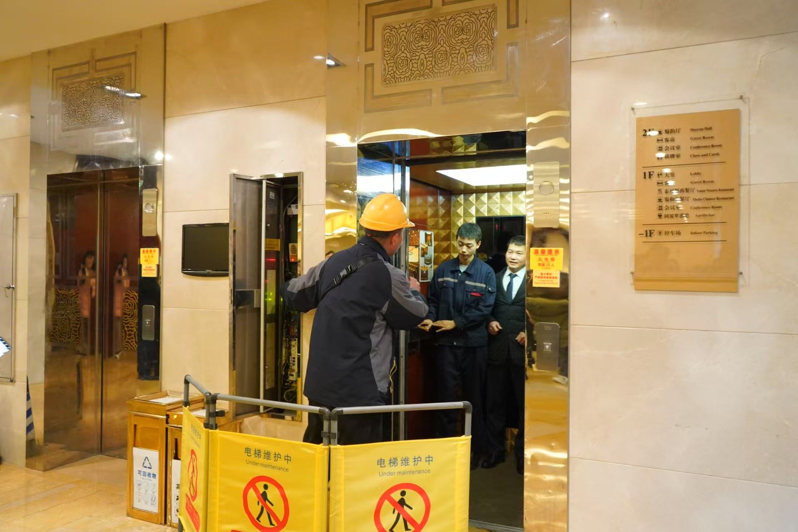 演练模拟电梯在运行过程中突发故障,导致乘客被困的场景。“事故”发生后,“被困乘客”迅速按下紧急通话按钮求救;监控室值班人员第一时间接到报警,立即通知电梯维保人员与应急救援小组赶赴现场,救援小组按照应急预案迅速展开行动,通讯联络组全程与“被困乘客”保持通话,安抚其紧张情绪;救援行动组凭借专业技能,精准判断电梯位置,熟练操作救援工具,迅速安全救出“被困乘客”。