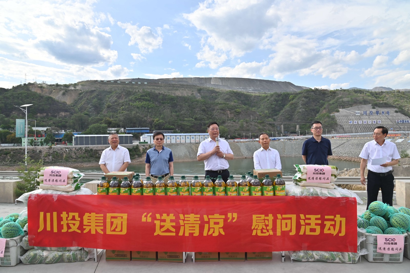 在银江水电站,督导检查组深入康家沟渣场、大坝基坑施工现场,重点检查了攀水电公司“迎大运•保安全”集中整治、重大事故隐患专项排查整治、安全生产责任落实以及风险辨识管控情况,并代表集团公司慰问了攀水电公司及电站参建单位一线员工,为大家送上防暑降温物资。